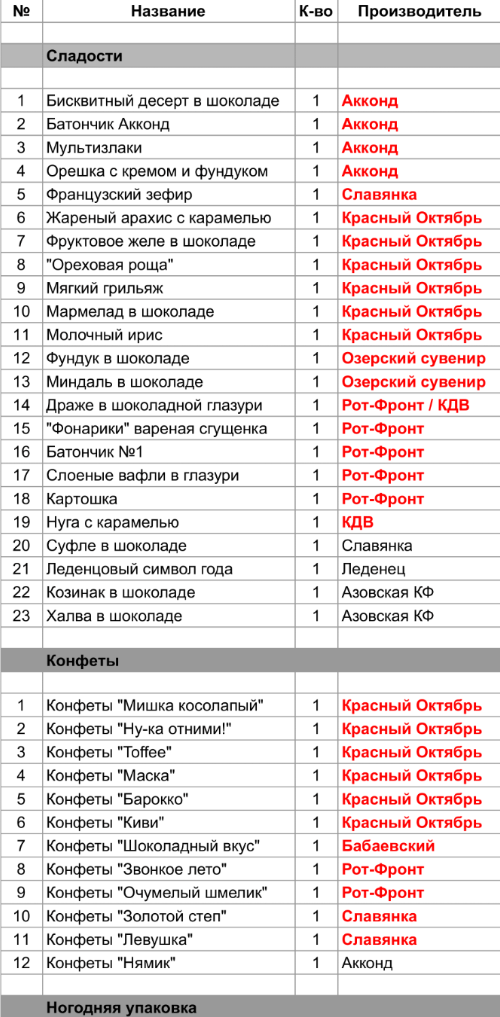 Жареный арахис с карамелью (1 шт), Фруктовое желе в шоколаде (1 шт), "Ореховая роща" (1 шт), Мягкий грильяж (1 шт), Мармелад в шоколаде (1 шт), Молочный ирис (1 шт), Конфеты "Мишка косолапый" (1 шт), Конфеты "Ну-ка отними!" (1 шт), Конфеты "Toffee" (1 шт), Конфеты "Маска" (1 шт), Конфеты "Барокко" (1 шт), Конфеты "Киви" (1 шт)