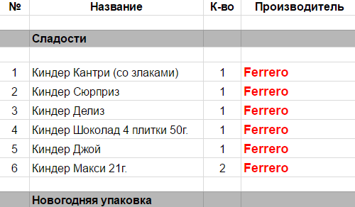 Киндер Сюрприз (1 шт), Киндер Макси 21 г. (2 шт), Киндер Кантри (со злаками) (1 шт), Киндер Джой (1 шт), Киндер Шоколад 4 плиток 50г. (1 шт), Киндер Делис (1 шт)