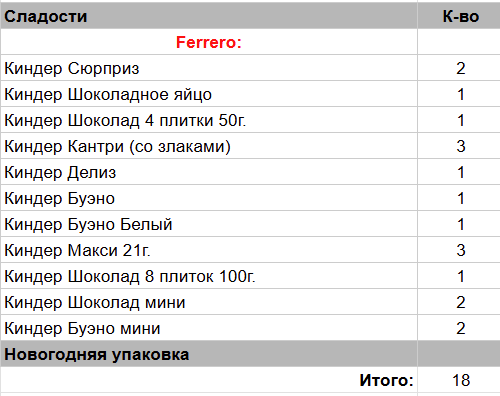 Киндер Сюрприз (3 шт), Киндер Шоколад 4 плиток 50г. (1 шт), Киндер Кантри (со злаками) (2 шт), Киндер Делис (1 шт), Киндер Буэно (1 шт), Киндер Макси 21 г. (3 шт), Киндер Шоколад 8 плиток 100г. (1 шт), Киндер Бонс (1 шт)