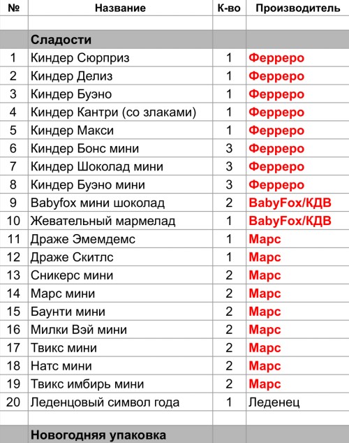 Киндер Сюрприз (1 шт), Киндер Делиз (1 шт), Киндер Буэно (1 шт), Киндер Кантри (со злаками) (1 шт), Киндер Макси (1 шт), Киндер Бонс мини (3 шт), Киндер Шоколад мини (3 шт), Киндер Буэно мини (3 шт)
