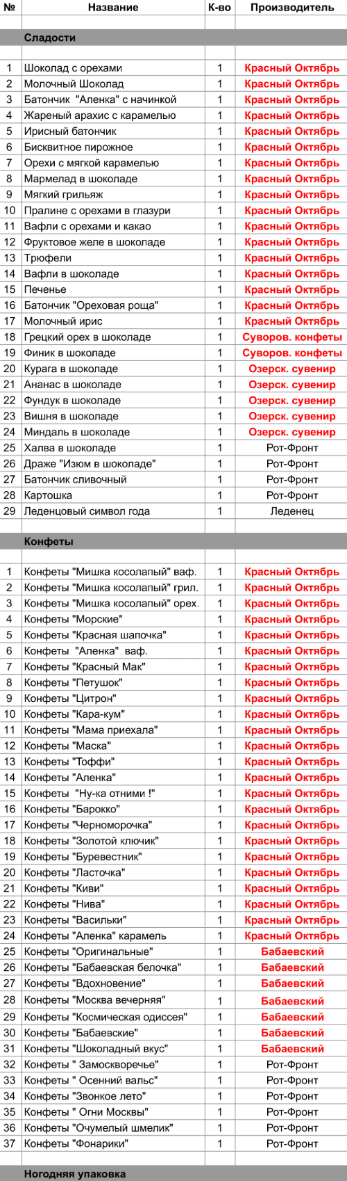 Шоколад с орехами (1 шт), Молочный Шоколад (1 шт), Батончик "Аленка" с начинкой (1 шт), Жареный арахис с карамелью (1 шт), Ирисный батончик (1 шт), Бисквитное пирожное (1 шт), Орехи с мягкой карамелью (1 шт), Мармелад в шоколаде (1 шт), Мягкий грильяж (1 шт), Пралине с орехами в глазури (1 шт), Вафли с орехами и какао (1 шт), Фруктовое желе в шоколаде (1 шт), Трюфели (1 шт), Вафли в шоколаде (1 шт), Печенье (1 шт), Батончик "Ореховая роща" (1 шт), Молочный ирис (1 шт), Конфеты "Мишка косолапый" ваф. (1 шт), Конфеты "Мишка косолапый" грил. (1 шт), Конфеты "Мишка косолапый" орех. (1 шт), Конфеты "Морские" (1 шт), Конфеты "Красная шапочка" (1 шт), Конфеты "Аленка" ваф. (1 шт), Конфеты "Красный Мак" (1 шт), Конфеты "Петушок" (1 шт), Конфеты "Цитрон" (1 шт), Конфеты "Кара-кум" (1 шт), Конфеты "Мама приехала" (1 шт),Конфеты "Маска" (1 шт), Конфеты "Toффи" (1 шт), Конфеты "Аленка" (1 шт), Конфеты "Ну-ка отними !" (1 шт), Конфеты "Барокко" (1 шт), Конфеты "Черноморочка" (1 шт), Конфеты "Золотой ключик" (1 шт), Конфеты "Буревестник" (1 шт), Конфеты "Ласточка" (1 шт), Конфеты "Киви" (1 шт), Конфеты "Нива" (1 шт), Конфеты "Васильки" (1 шт), Конфеты "Аленка" карамель (1 шт)